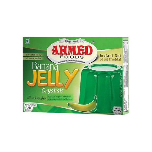 Ahmed Banana Jelly is a popular, gelatin-free sweet, wobbly and jiggly jelly mix. Quick and easy preparation. 100% Halal ingredients includes sugar, a plant based gelling agents (like carrageenan), citric acid, artificial banana flavor and food colors. Provide rich, juicy, authentic taste of bananas. Vibrant tropical banana flavor with smooth, soft, wobbly and melt-in-your-mouth texture. Used as alone, with ice cream, custard, fruit salads, cake decorations, snack for children at homes and gatherings.