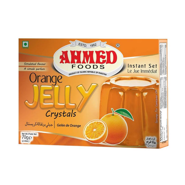 Ahmed Orange Jelly is a popular, gelatin-free sweet, wobbly and jiggly jelly mix. Quick and easy preparation. 100% Halal ingredients includes sugar, a plant based gelling agents (like carrageenan), citric acid, artificial orange flavor and food colors. Provide rich, juicy, authentic taste of ripe oranges. Vibrant tropical orange flavor with smooth, soft, wobbly and melt-in-your-mouth texture. Used as alone, with ice cream, custard, fruit salads, cake decorations, snack for children at homes and gatherings.