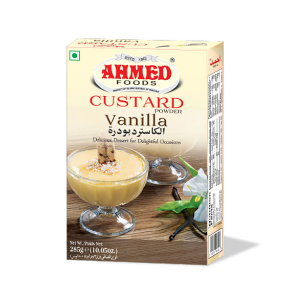 Ahmed Vanilla Custard is a popular rich, classic vanilla flavor custard mix. Quick and easy preparation. 100% Halal quality ingredients includes corn starch, salt, artificial vanilla flavor and food colors. Provide authentic comforting vanilla flavor with smooth, silky and creamy texture. Used as a custard, trifles, fruit salads, pudding, cake filling and milk shakes. Perfect for sweet dishes after lunch or dinner for homes gatherings. For special events, festivals and wedding ceremonies.