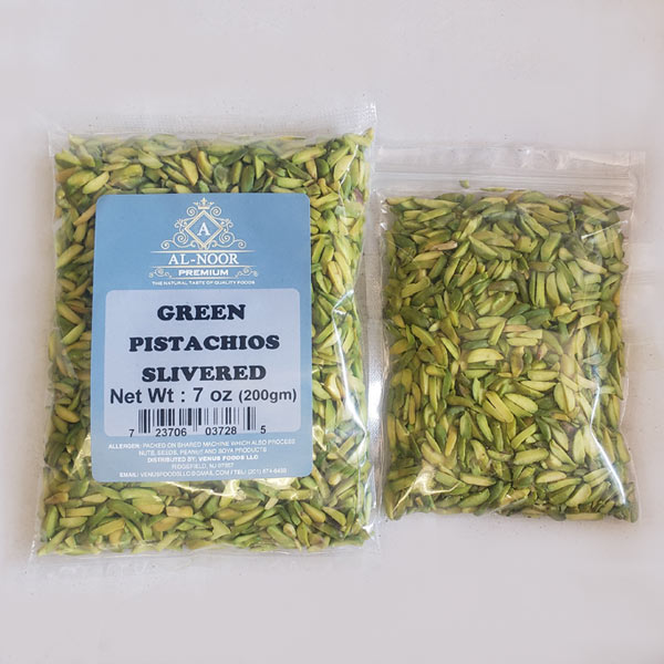 Al-Noor Premium Green Pistachios 100% Halal naturally thin, vibrant green, elongated pieces of shelled pistachio kernel. Offering delicate, crunchy, rich nutty flavor and nutrients. Perfect for garnishing desserts, pastries, salads and adding in baked goods and rice dishes for color and texture for all family members.