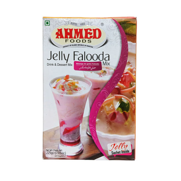 Ahmed Jelly Falooda Mix is a delightful dessert. 100% Halal natural ingredients include rose syrup, basil seeds, falooda sevi (vermicelli) and fruity jelly. Provides vibrant colors and creamy texture and sweet aromatic taste. Perfect for warm weathers and special occasions like Eid festivals for all family members.