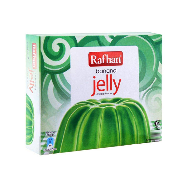 Rafhan Banana Jelly is a popular, gelatin-free sweet, wobbly and jiggly jelly mix. Quick and easy preparation. 100% Halal ingredients includes sugar, a plant based gelling agents (like carrageenan), citric acid, edible gum, artificial banana flavor with soya bean and food colors. Provide rich, juicy, authentic taste of bananas. Vibrant tropical banana flavor with smooth, soft, wobbly and melt-in-your-mouth texture. Used as alone, with ice cream, custard, fruit salads, cake decorations, snack for children at homes and gatherings.