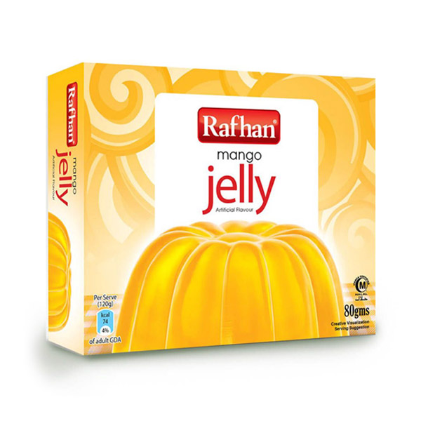 Rafhan Mango Jelly is a popular, gelatin-free sweet, wobbly and jiggly jelly mix. Quick and easy preparation. 100% Halal ingredients includes sugar, a plant based gelling agents (like carrageenan), citric acid, edible gum, artificial mango flavor with soya bean and food colors. Provide rich, juicy, authentic taste of ripe mangoes. Vibrant tropical mango flavor with smooth, soft, wobbly and melt-in-your-mouth texture. Used as alone, with ice cream, custard, fruit salads, cake decorations, snack for children at homes and gatherings.