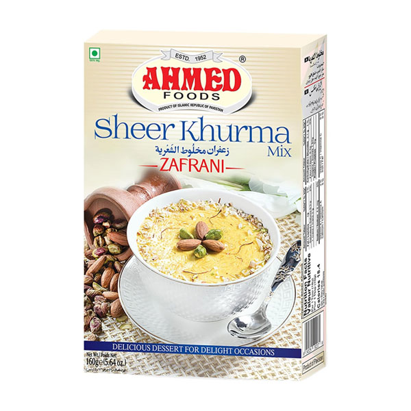Ahmed Sheer Khurma Mix – Zafrani is a traditional, rich vermicelli pudding mix. 100% Halal ingredients includes fine vermicelli, milk, dry dates (Khurma), sugar, ghee, nuts like almond, pistachio, cashews raisins and saffron. Provide sweet, rich and aromatic flavor with creamy, rich, thick and aromatic texture. Perfect as a sweet dish after lunch or dinner for home gatherings, parties and special occasions like Eid festivals.