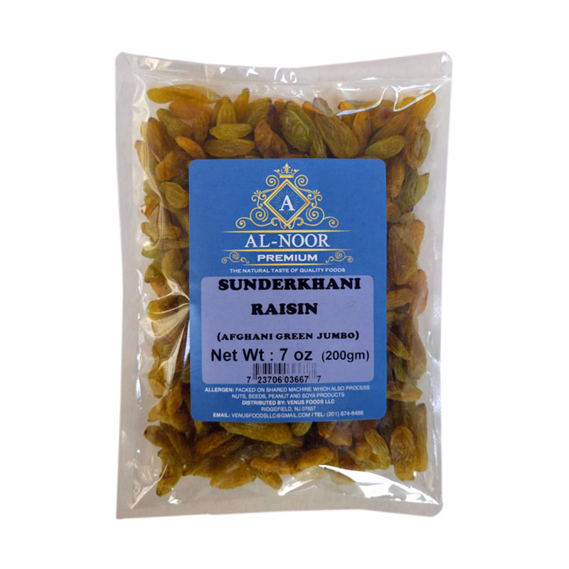 Al-Noor Premium Afghani long golden-green seedless Sunderkhani raisin are plump, naturally sun-dried, often called “nature’s candy”. Rich in high fiber, iron, calcium, antioxidants, vitamins and others minerals, making them a nutritious, energy-boosting snack. It has intense natural sweetness with soft, plump and chewy texture. Ideal use for baking items, trail mixes, sweet dishes, desserts, cereals and salads for all family members. Eaten alone as snacking with tea or coffee. Supporting digestive health, heart health and bone strength.