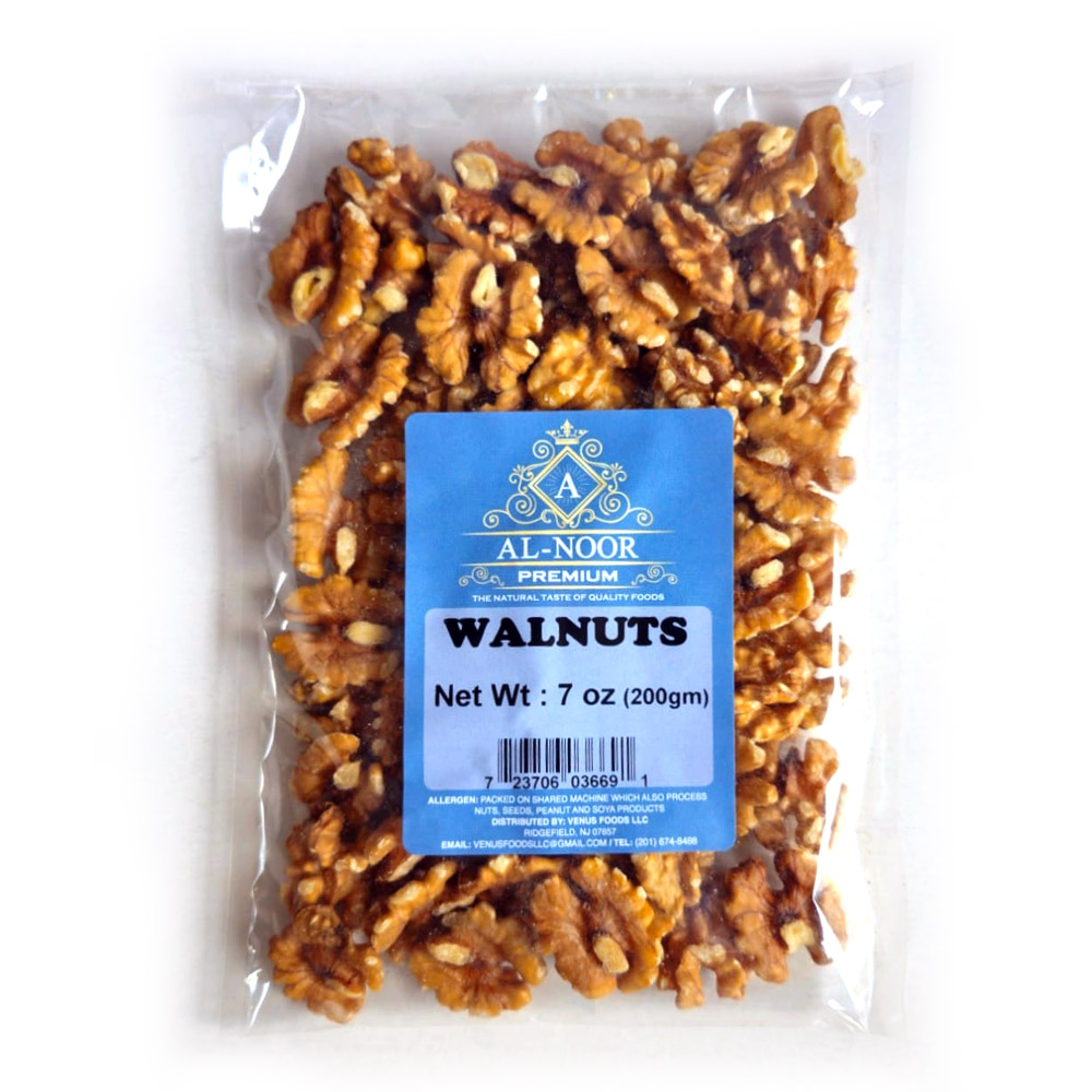 Al-Noor Premium walnuts (Kernel) are 100% Halal naturally light color, thin shells and rich, slightly sweet, soft and crispy flavor with crunchy texture. High in omega-3s (heart/ brain/ health), protein, fiber, vitamin-E, antioxidants and magnesium. Excellent for brain, health and heart functions and digestion. Enjoying as a healthy snack, add to salads, cereals, in baked items, sweet dishes and desserts. Especially eating alone with tea & coffee in winters for all family members.